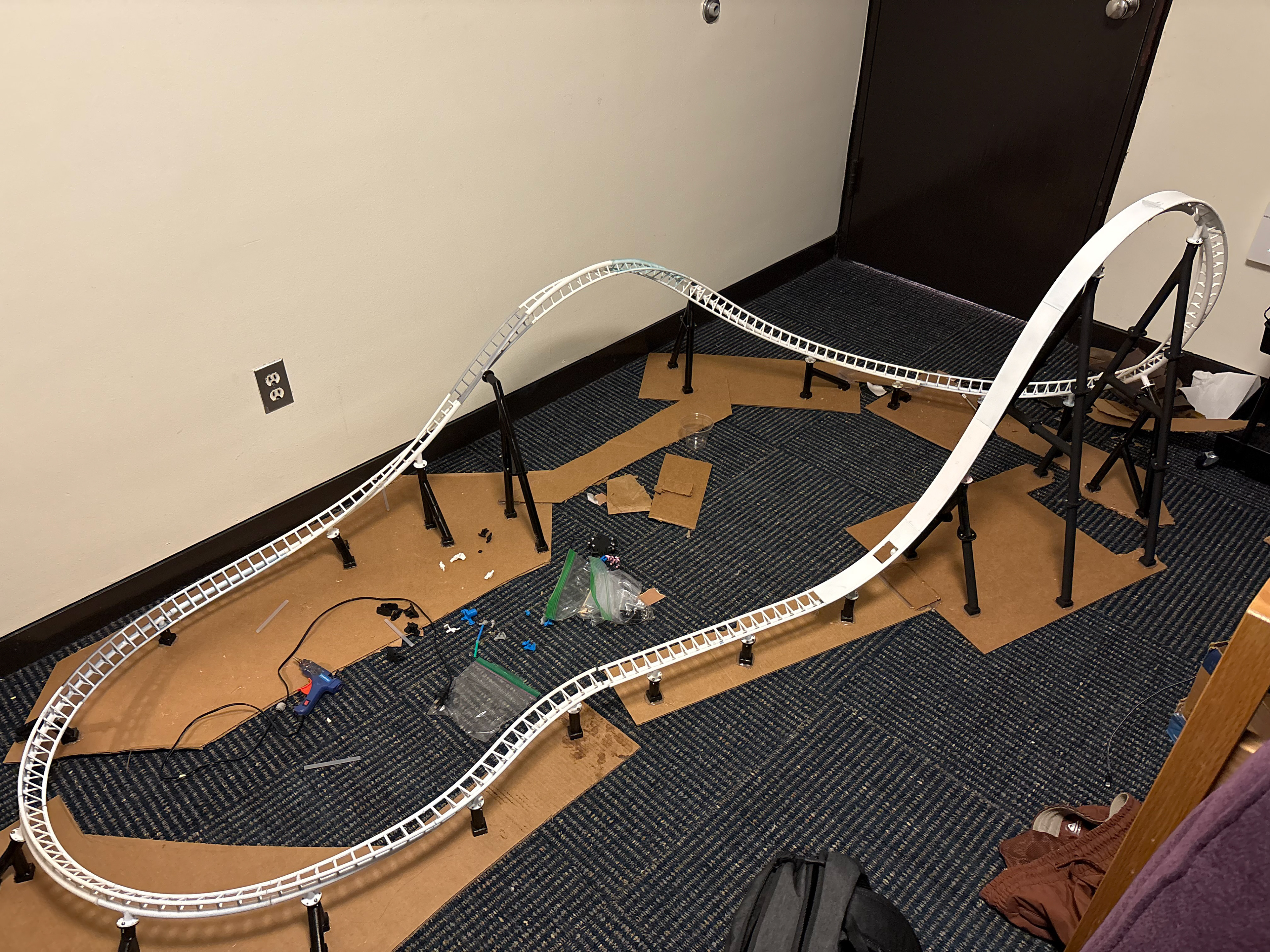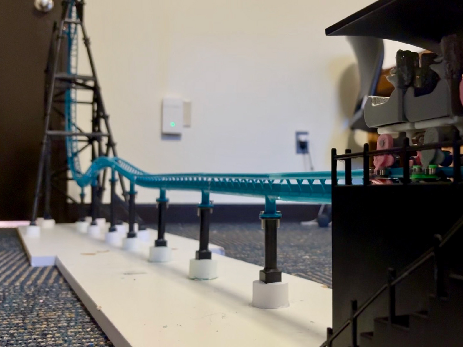 After finalizing a feasible design in NoLimits, I used my Python script to convert the rails into 27 track segments, then modeled the track and support components in SolidWorks for assembly. The overall approximate track scale is 35:1.