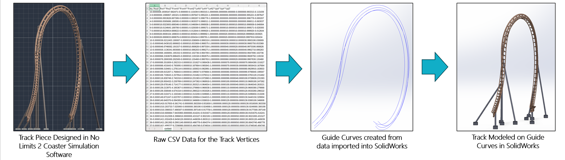 After researching existing workflows, I discovered that NoLimits Coaster Simulation allows CSV spine data to be exported and then converted into TXT rail files that can be imported into SolidWorks as curve geometry for track modeling.