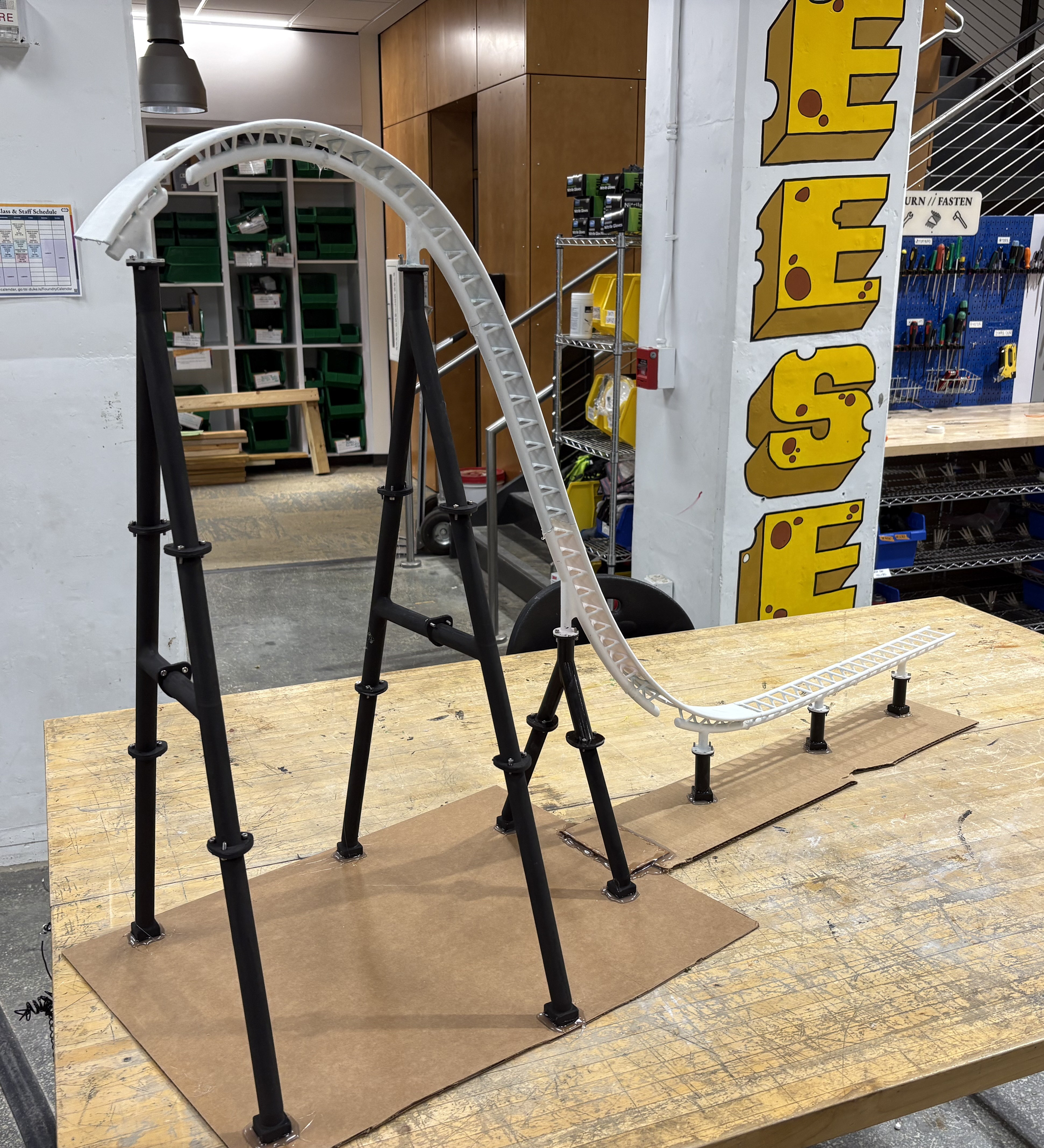 The support structure was developed by blending typical roller‑coaster support geometries with calculated force requirements. I analyzed the estimated loads at key points along the track and used those results to determine column placement, bracing angles, and connection locations.
