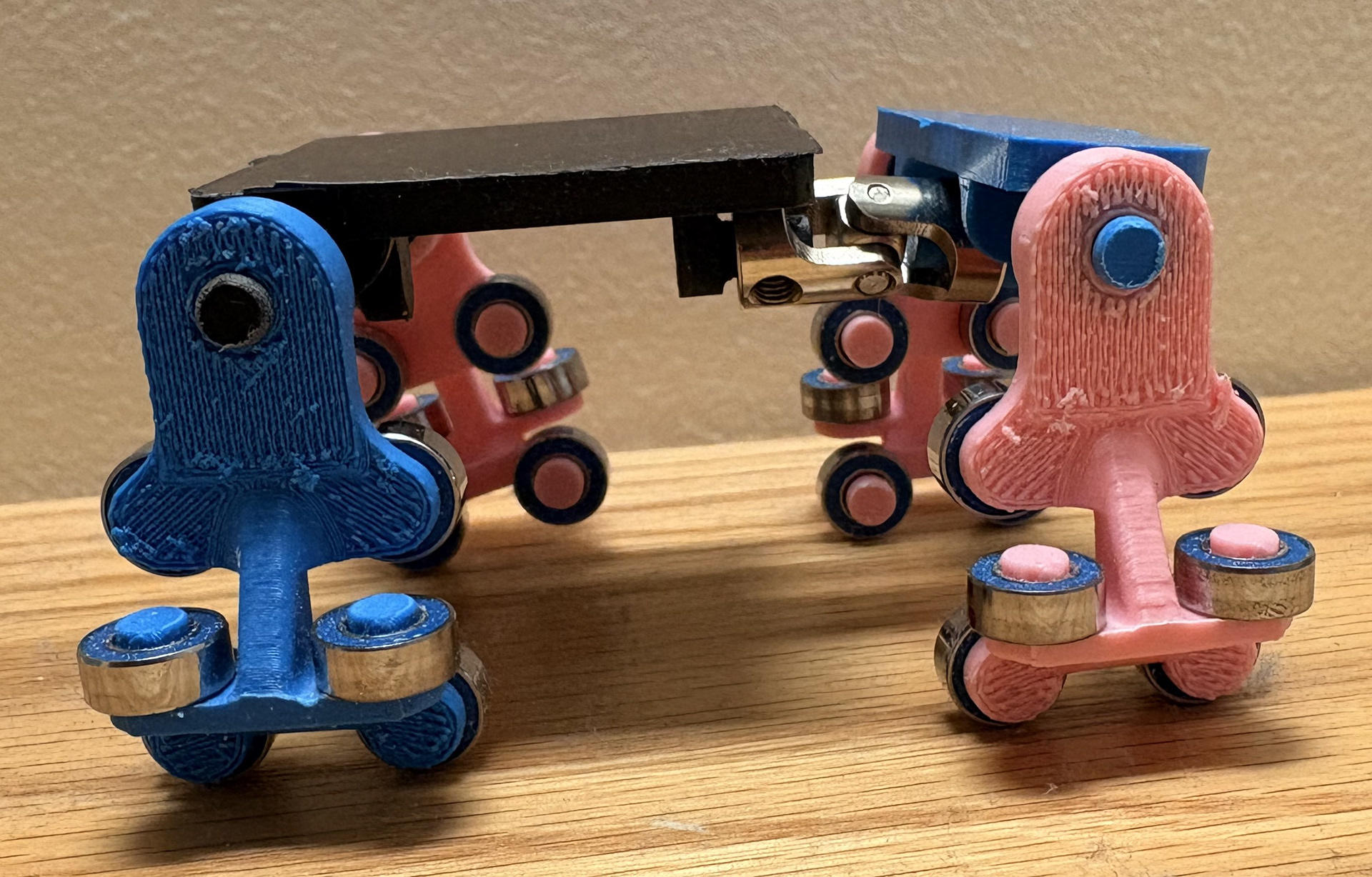 The next bogie prototypes addressed both issues. The chassis incorporated purchased U‑joints and two wheel sets per bogie, significantly improving stability and mobility. I also introduced a ball‑bearing interface between the chassis and bogie, adding a degree of freedom.
